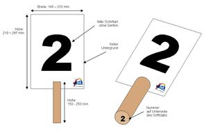 - Die Nummern müssen sich deutlich vom Untergrund abheben und sind beidseitig aufzubringen! Es sollte eine Schriftart ohne Serifen verwendet werden. Geeignet ist z.B. die Schriftart Arial Black. Die Schriftgröße sollte in Abhängigkeit der Tafelabmessungen maximal groß gewählt werden. Ziffern zum Aufkleben gibt es in verschiedenen Größen im Fachhandel sowie im Internet.